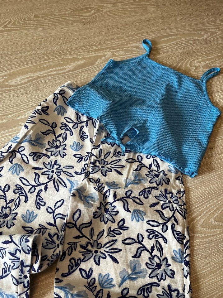Mavi örgü askılı üst ve pastel tonlarda çiçek desenli pantolonlu kız takımı.