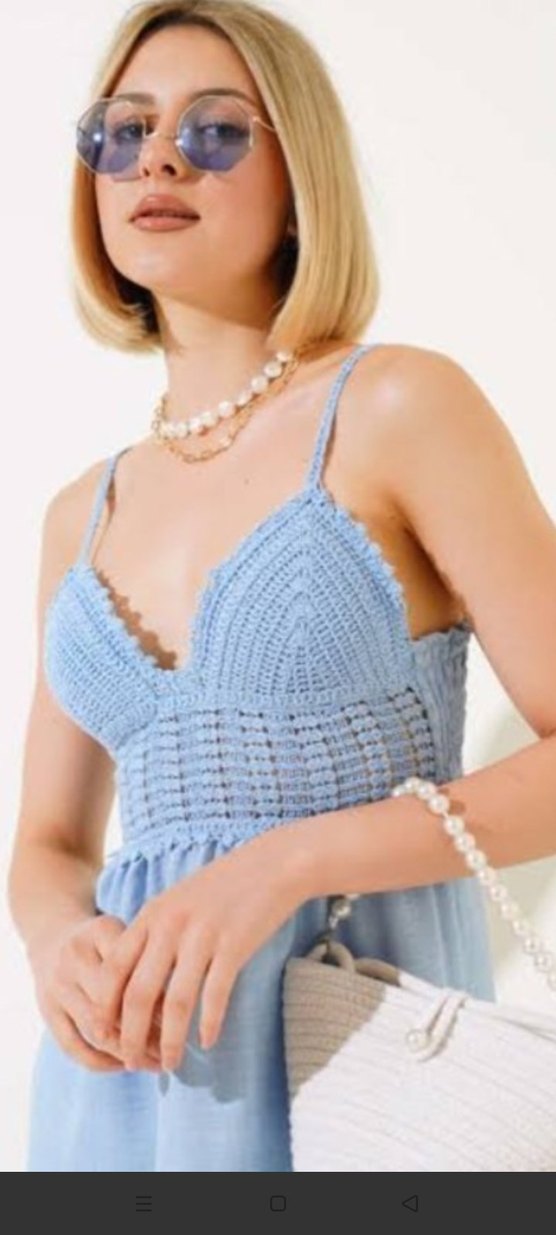 V yaka, askılı ve boncuk detaylı mavi örgü mini büstiyer, günlük kullanıma uygun bohem tarzda şık bir parça.