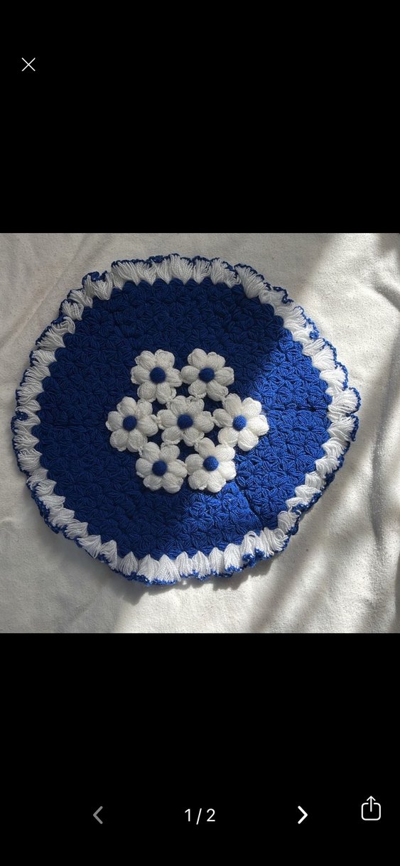 , mavi zemin üzerinde beyaz çiçek nakışlı renkli örgü malzemeden üretilmiştir. Yumuşak dokulu ve süslü kenarlıklıdır.