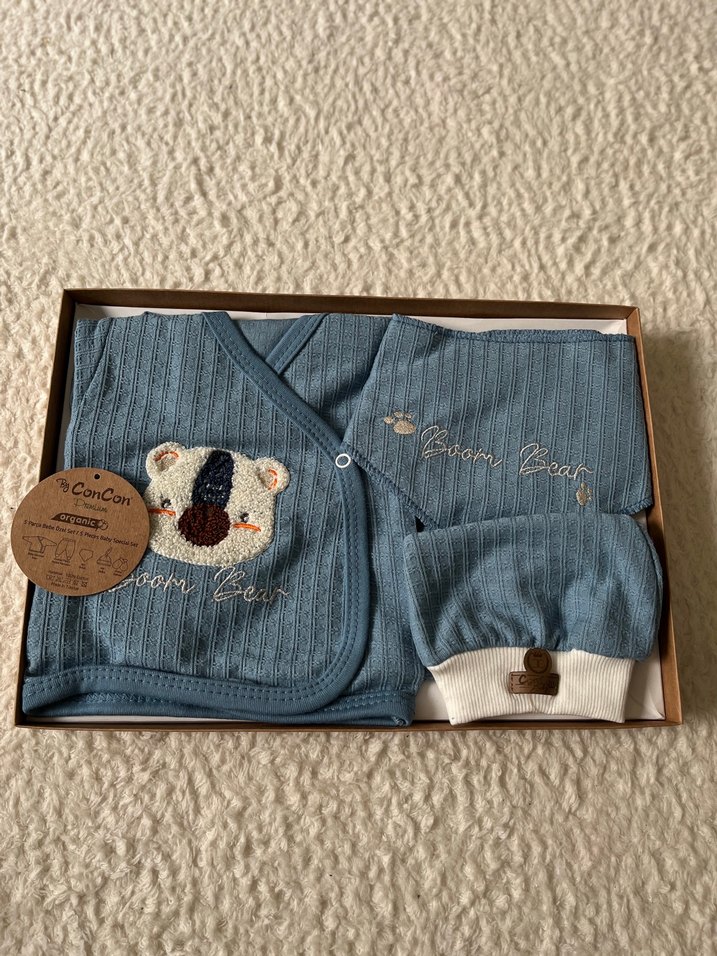Mavi renkli, uzun kollu ve bisiklet yaka örgü bebek hastane kıyafeti,süzene nakış ayıcık detaylıdır. Yumuşak ve sıcak kumaştan, pantolon, eldiven şapka ve önlük ile tamamlanmıştır.