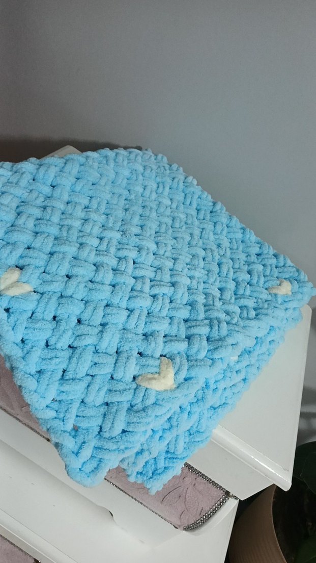 Yumuşak dokulu, pastel mavi örgü bebek battaniyesi, küçük kalp detaylarıyla rahat ve konforlu.