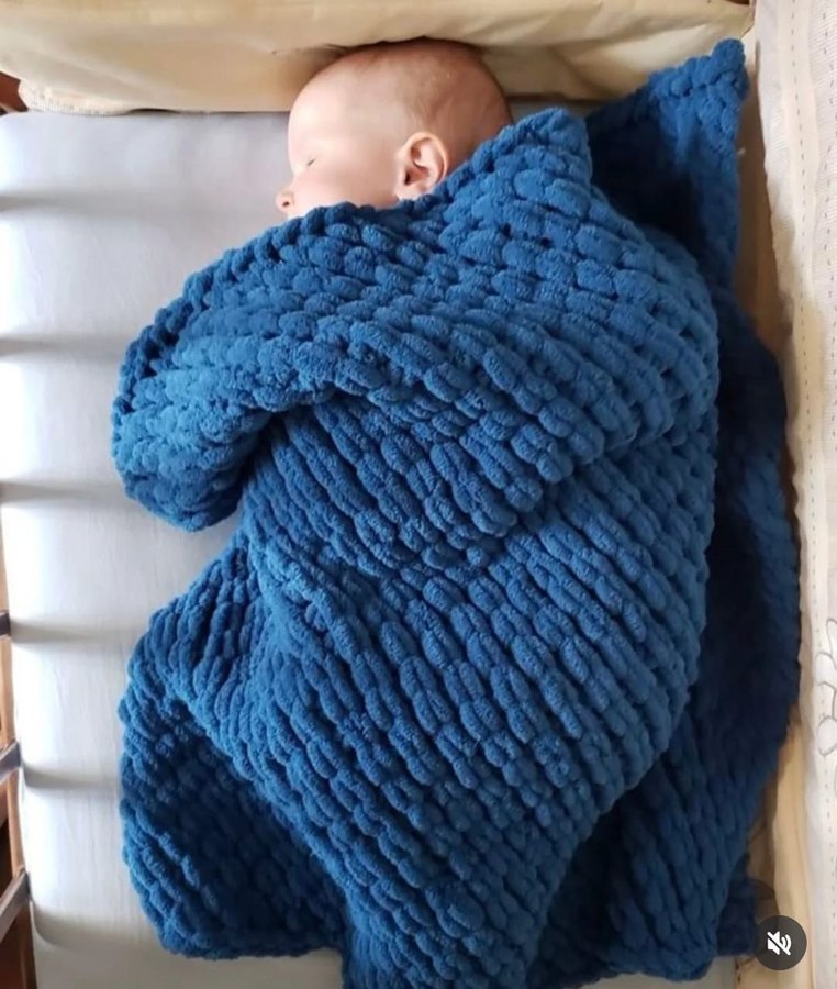 Kalın dokulu, yumuşak ve rahat mavi örgü bebek battaniyesi, çocuklar için sıcaklık sağlar.