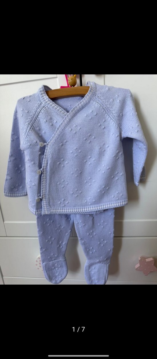 Pastel mavi örgü, deseniz uzun kollu bebek hastane kıyafeti. Düğmeli çapraz üst ve ayaklı pantolon içerir. Yurt dışından alındı