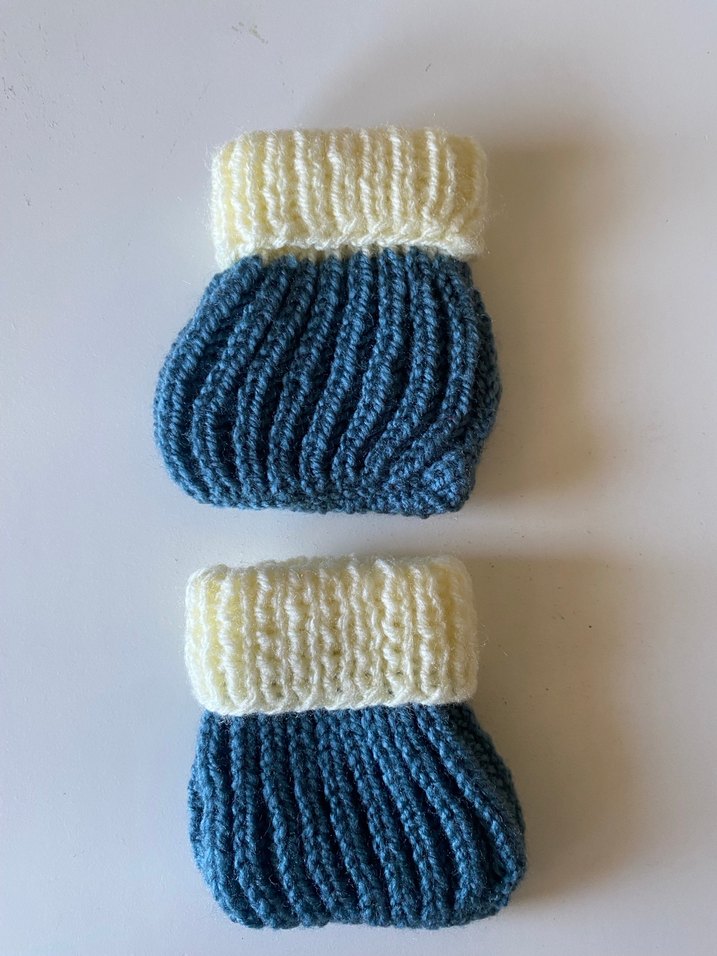 Mavi renkli, yumuşak dokulu örgü bebek patikleri beyaz manşet ile sade ve renkli bir tasarıma sahiptir.