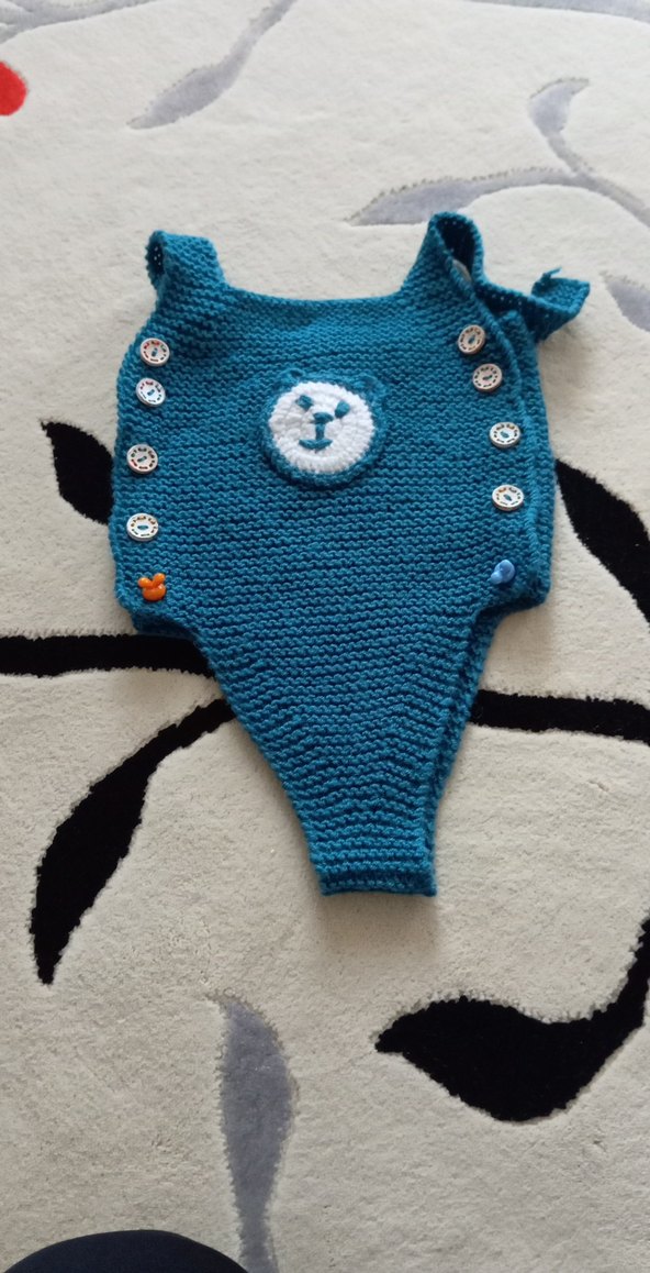 Mavi örgü bebek tulumu, yuvarlak yaka ve askılı kollara sahip. Nakışlı aslan deseni ve renkli düğmelerle bohem tarzında.
