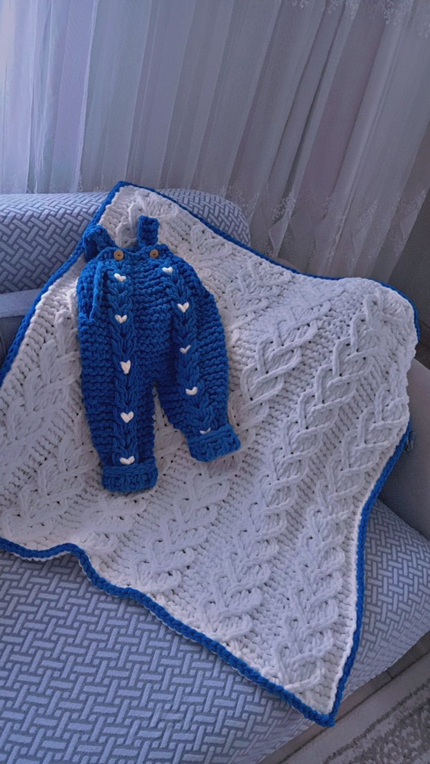 Canlı mavi renkte, örgü bebek tulumu. Küçük kalp detaylarıyla sade ve yumuşak dokulu, bebeğinizi sıcak tutar. Beyaz kalp desenli etrafı mavi battaniye ❄️