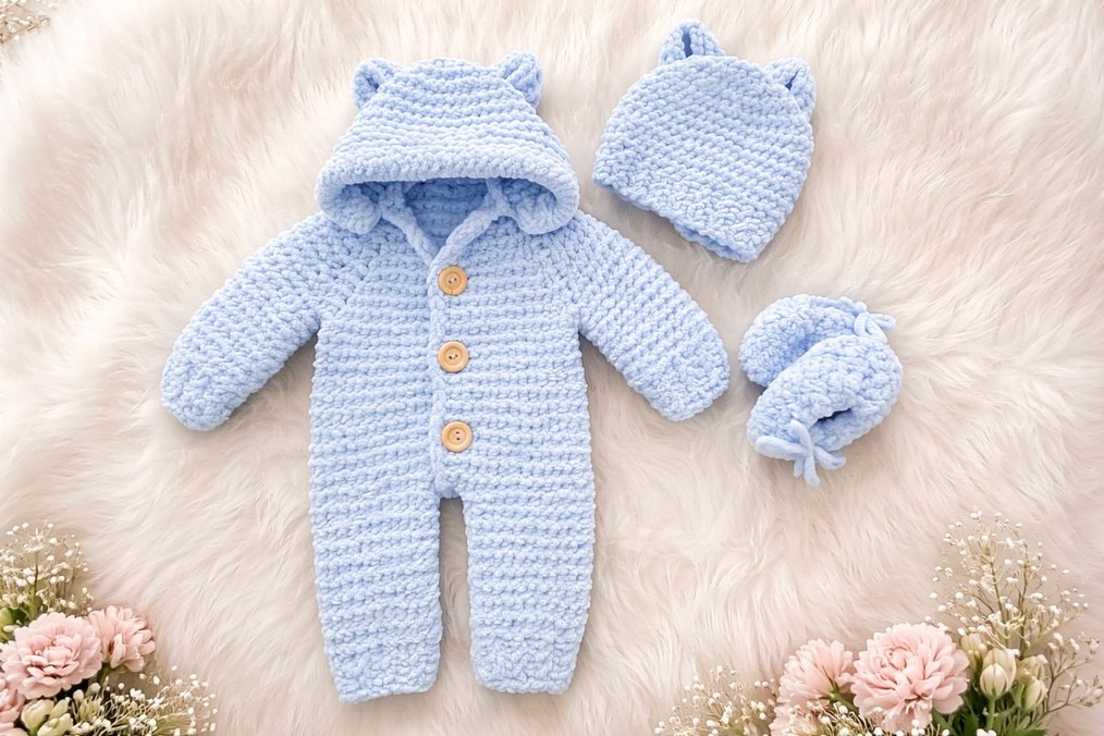 Mavi Örgü Bebek Tulumu ve Şapka Seti