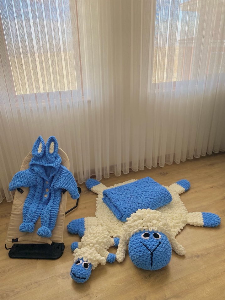 Renkli örgüden yapılmış mavi tavşan kulaklı tulum ve koyun şeklinde halı ile battaniye içeren çocuk uyku seti.
