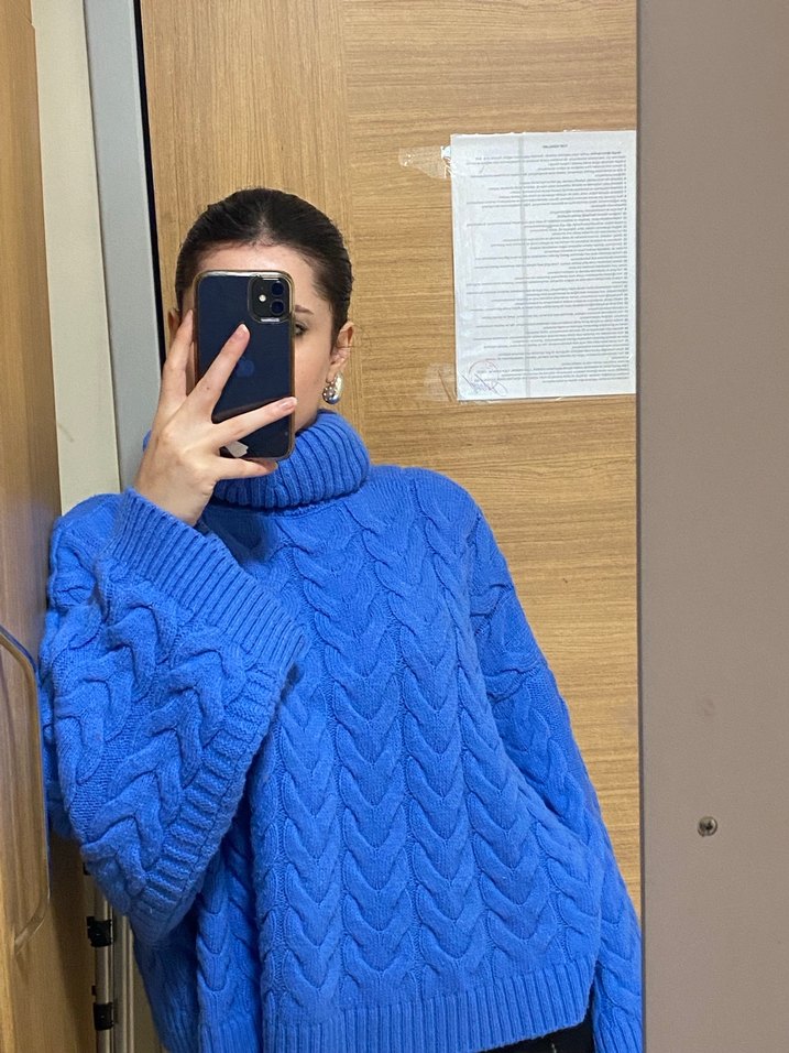 Mavi renkli, örgü ve boğazlı uzun kollu kazak. Rahat kesimi ve normal boyuyla günlük kullanıma uygundur. Desensiz, rahat bir modeldir. Ve oversize kalıplıdır.