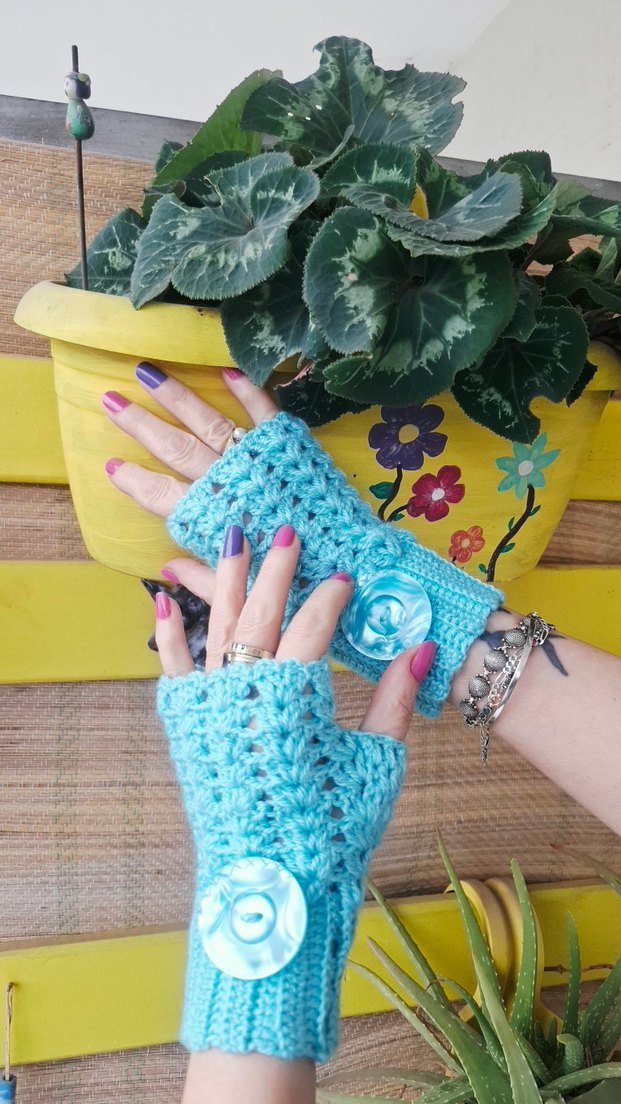 Büyük düğmeli turkuaz örgü, bohem tarzda kadın eldiveni. Sıcak ve renkli görünüm için ideal. Eldivenlerimizin tamamı el örgüsü ve özel tasarımdır. Rengarenk, cıvıl cıvıl, neşeli eldivenlerim, kışın içinizi ve gönlünüzü ısıtacak. Sıfır üründür. Bedeni standarttır. Eldiven çeşitlerim ve ürün yelpazem oldukça geniştir. Lütfen mağazamı ziyaret edip ürünlerimi inceleyin.