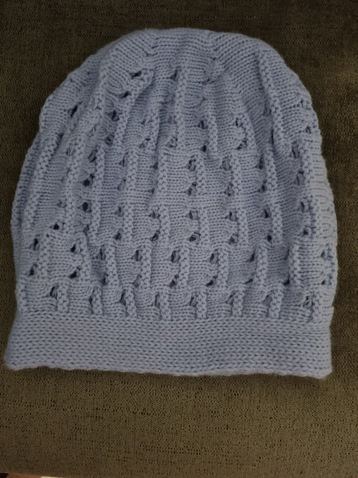 mavi renkte, örgü dokulu bohem tarzda kadın bere. Sıcak ve rahat bir kullanım sunar.