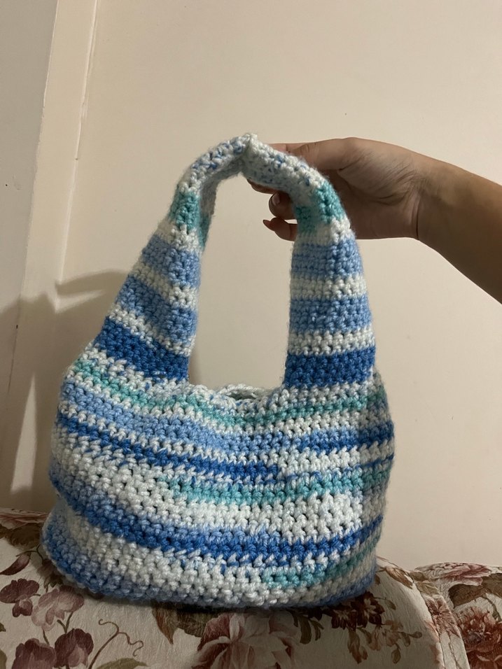 Kadınlar için örgü dokulu, pastel mavi tie-dye desenli, günlük kullanım için bohem ve rahat tarzda çanta.