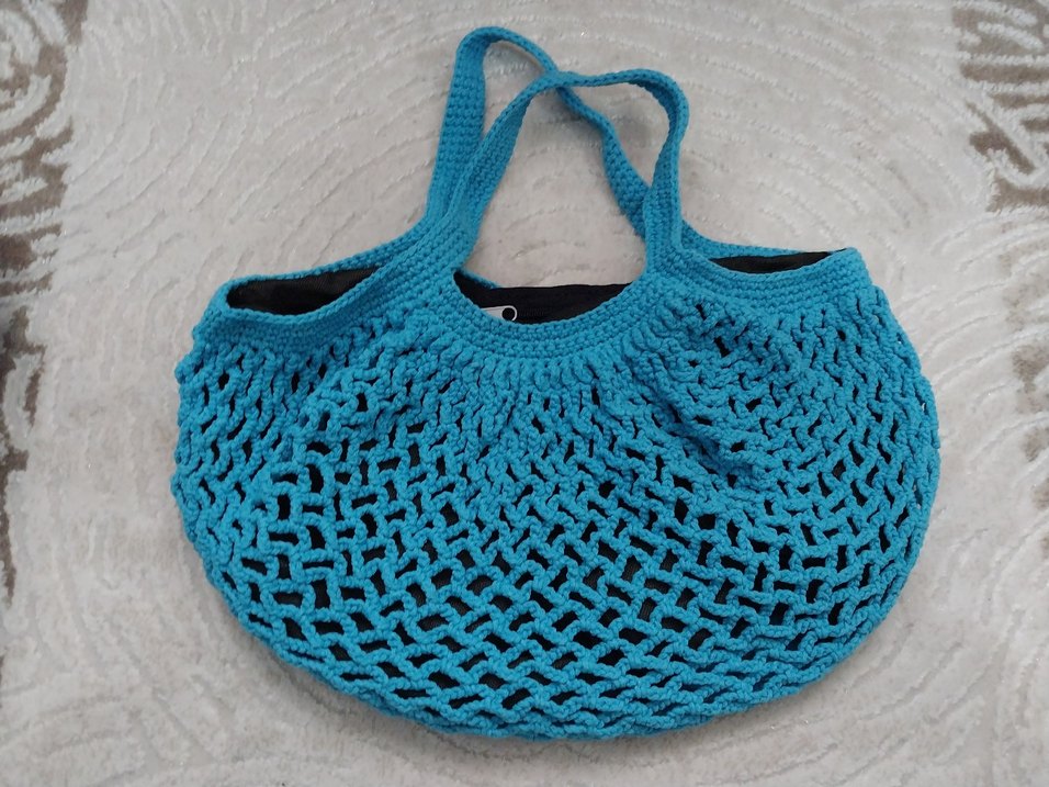 Mavi renkli, örgü dokulu, desen içermeyen ve çift saplı bohem tarzda kadın çantası. EN 40 CM BOY 25 CM