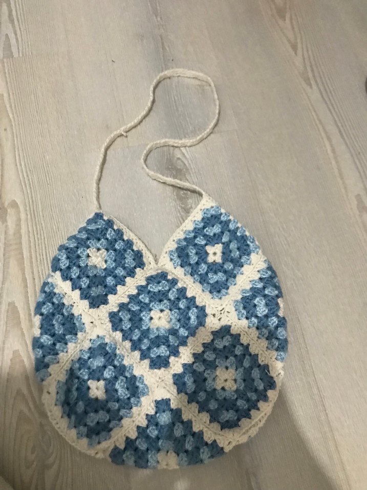 Mavi renklerde, örgü ve motif desenli, bohem tarzda yazlık kadın çantası. Örgü ip askılı, günlük kullanıma uygun. Kendim ördüm hiç kullanmadım.