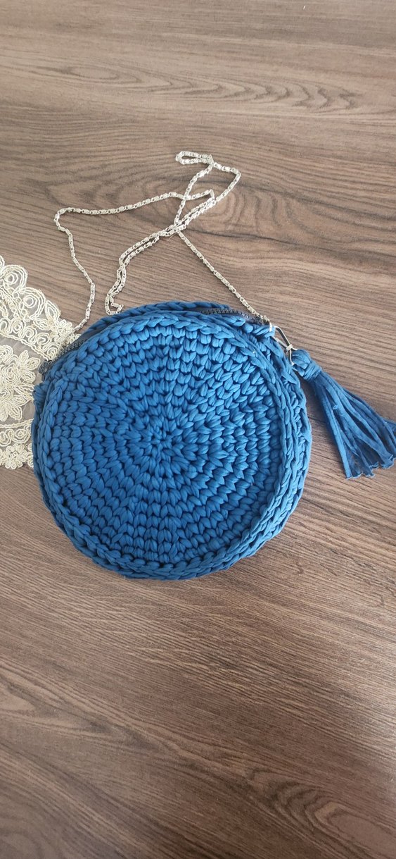 Mavi yuvarlak örgü kadın çantası, renkli nakış detayları ve püskülleriyle bohem tarzı yansıtıyor. Zincir askılıdır.