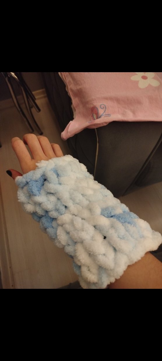 Pastel mavi renkte, yumuşak ve örgü bohem tarzda, rahat bir görünüm sunan kadın eldiveni.