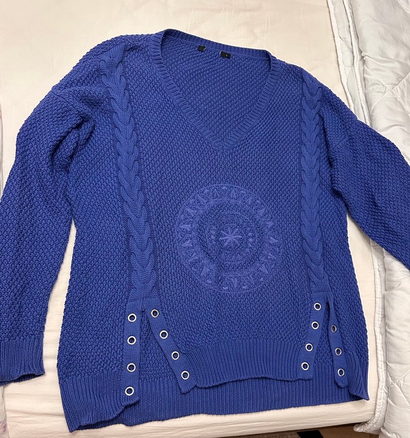 Mavi renkli, V yakalı, uzun kollu, bol kesim örgü kazak. Kenarında dekoratif halkalar bulunur, rahat ve bohem tarzı yansıtır.