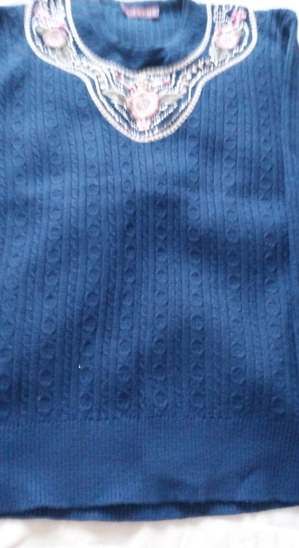 Parlak mavi örgü kumaştan, yuvarlak yakalı ve uzun kollu, rahat bohem tarzda, vücuda oturan kadın kazak.