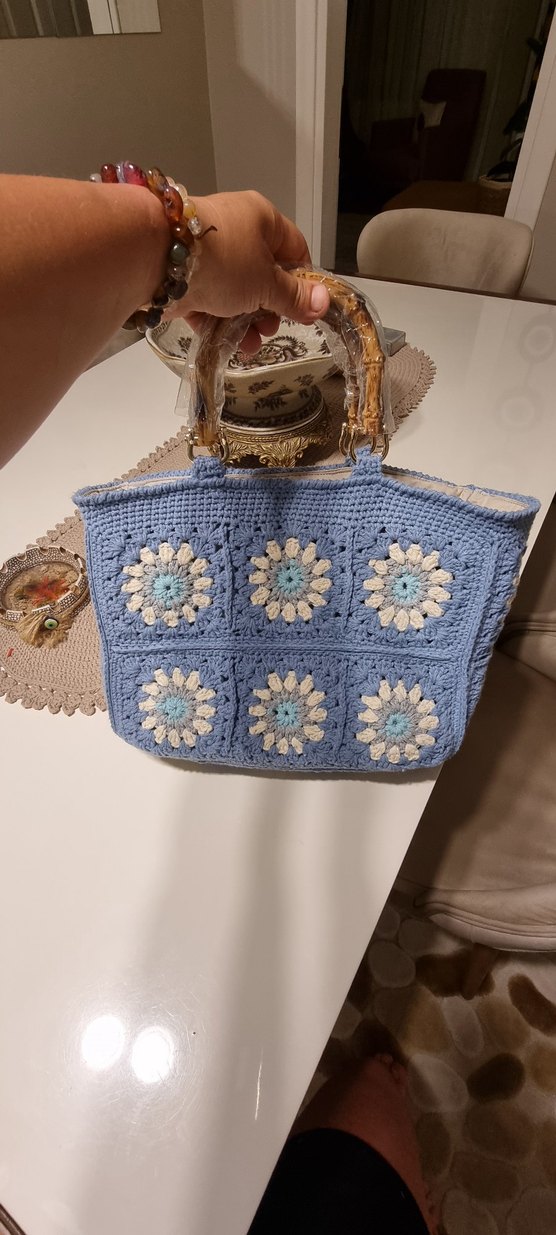 Pastel mavi çiçek desenli, örgü kumaştan yapılmış, bambu saplı bohem kadın çantası. Günlük kullanıma uygun, retro ve hippie tarzı yansıtır. astarli keçeli cepli coton iplerle örülmüş el emeği göz nuru çanta bambu sapli