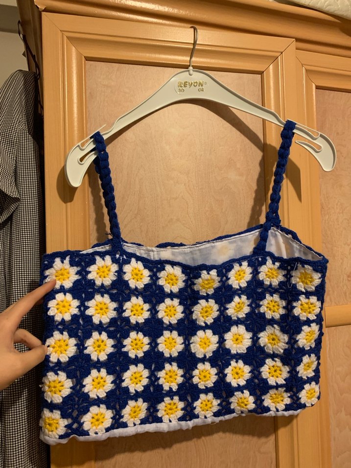 Mavi renkli, örgü kumaştan yapılmış, ince askılı ve straplez yaka detaylı, çiçek desenli bohem tarz crop top. Günlük kullanıma uygundur.