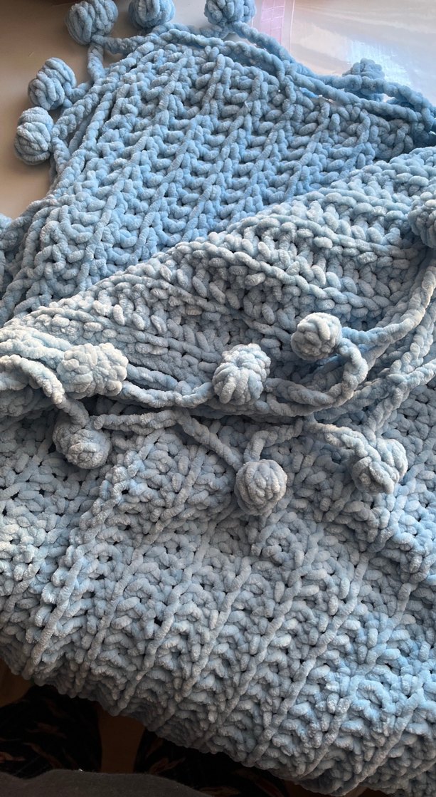 Kalın örgü dokulu, ponpon detaylı yumuşak mavi çocuk battaniyesi. Çocuklar için sıcak ve rahat bir ürün.