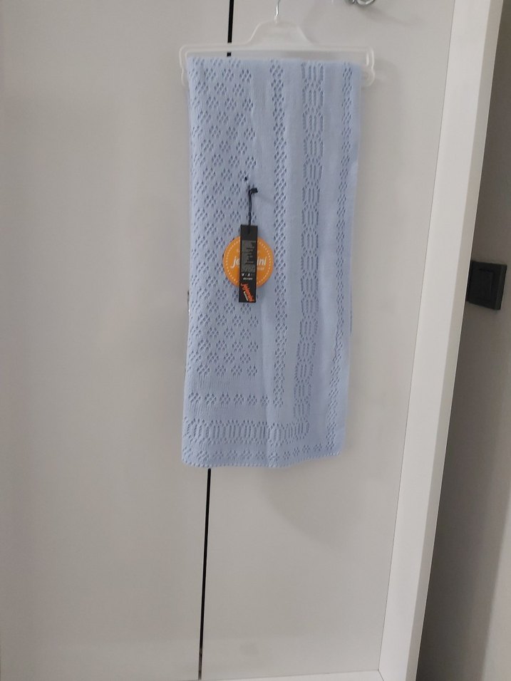 Mavi renkli, desen içermeyen yumuşak dokulu örgü çocuk battaniyesi.