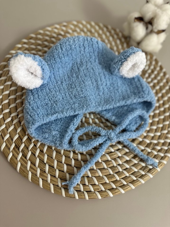 Pastel mavi örgü çocuk bere, yumuşak kumaş ve sevimli kulak detaylarına sahip, sıcak tutar. BO BABYKNİTWEAR kendi ürünümdür.