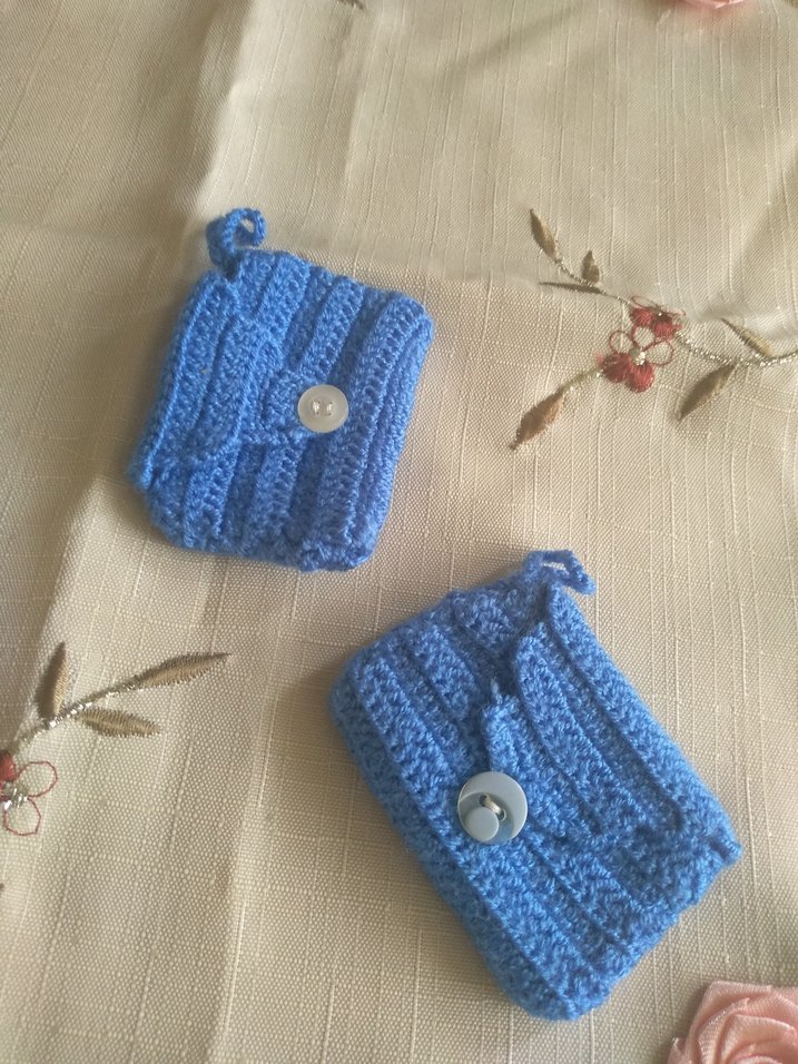 Düğmeli, mavi örgü çocuk cüzdanı, sade ve renkli bohem tarzda.