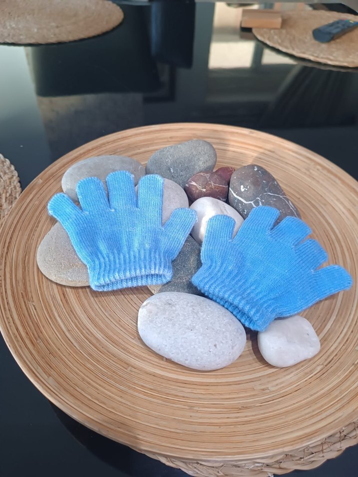Yumuşak örgü kumaştan yapılmış, renkli mavi tonunda sade ve desensiz Çocuk eldiveni. Hiç kullanılmadı 3 ile 5 yaş arası