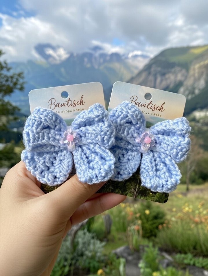Örgü mavi çocuk saç tokaları, işleme detaylı ve küçük pembe boncuklu, bohem tarzda. Yumuşak dokulu, çocuklar için uygun.