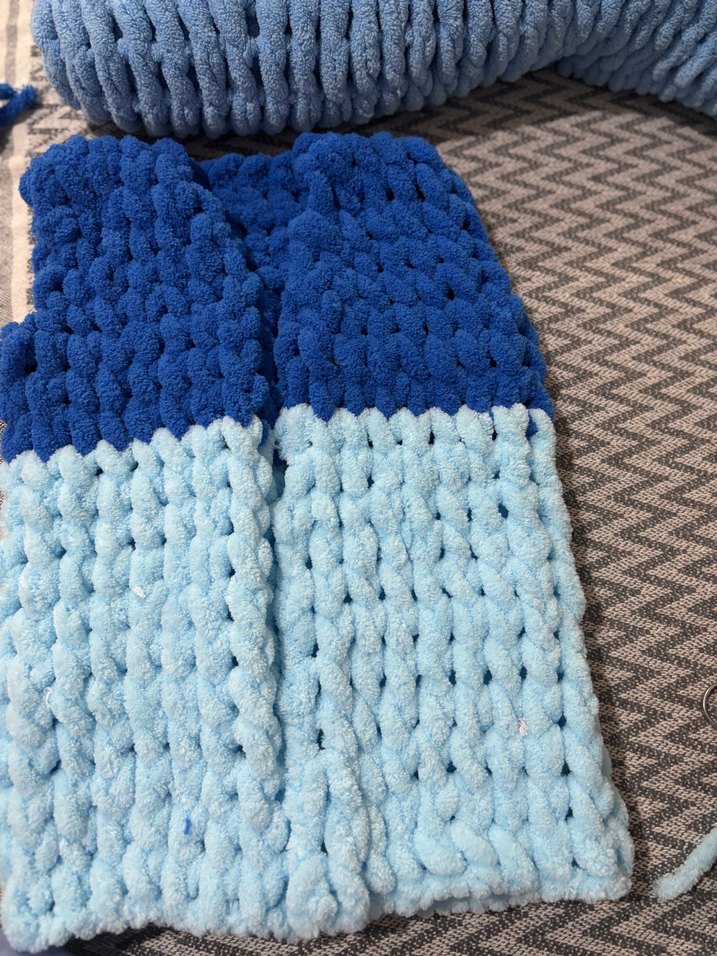 Bu çocuk yeleği , mavi ve lacivert tonlarında yumuşak örgü dokusuna sahiptir. Desensiz, rahat ve sade bir tasarım sunar. İstenilen renkte ve bedende örülür