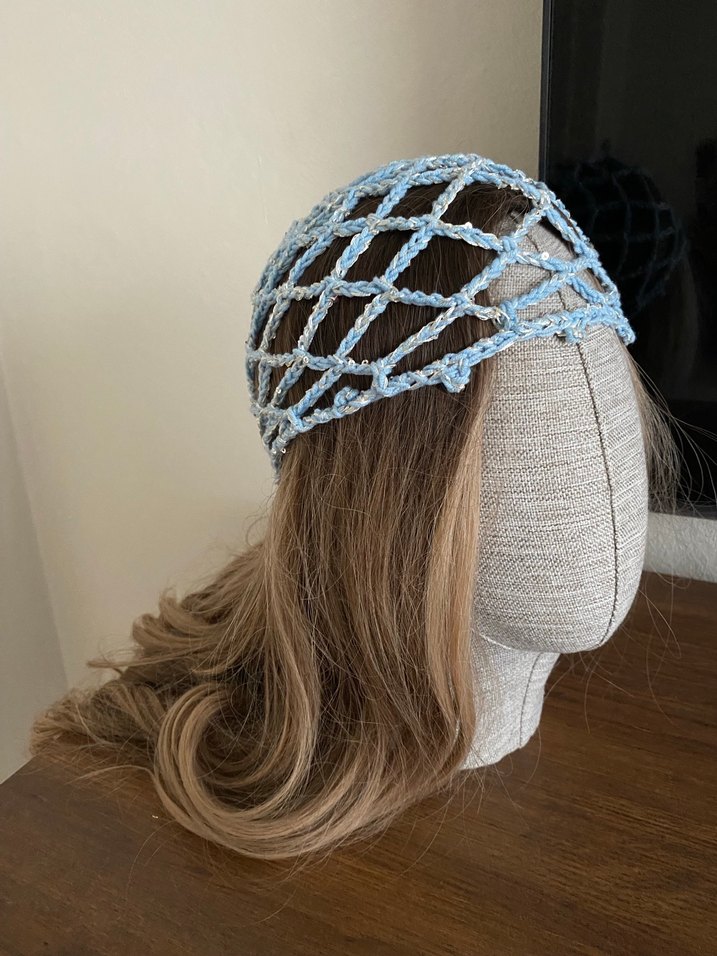 Pastel mavi örgü dantel detaylı saç aksesuarı, bohem ve retro tarzı yansıtır. Her görünüme özgün bir karşı kültür dokunuşu katar.