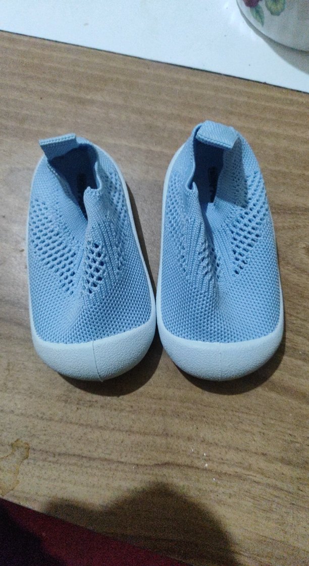 Mavi örgü üst yüzeye ve yumuşak kauçuk tabana sahip erkek bebek ilk adım ayakkabısı, rahatlık ve destek sağlar.