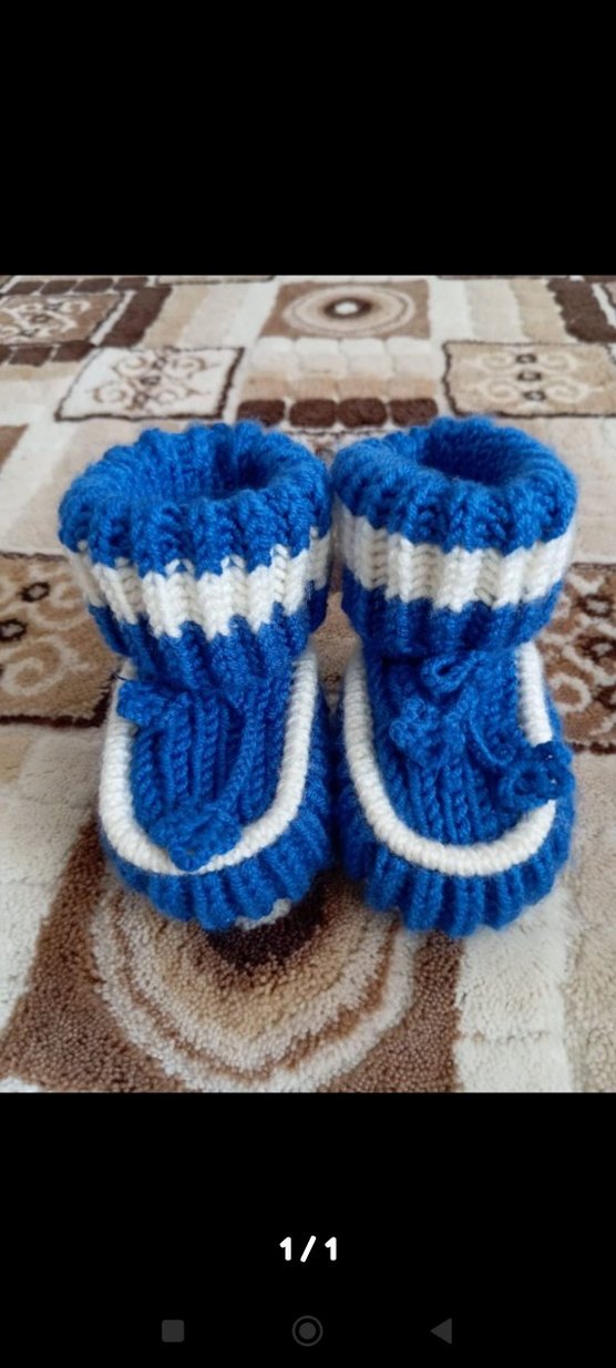 Mavi ve beyaz çizgili, yumuşak dokulu örgü erkek bebek patikleri, sade ve rahat bir tasarıma sahiptir.