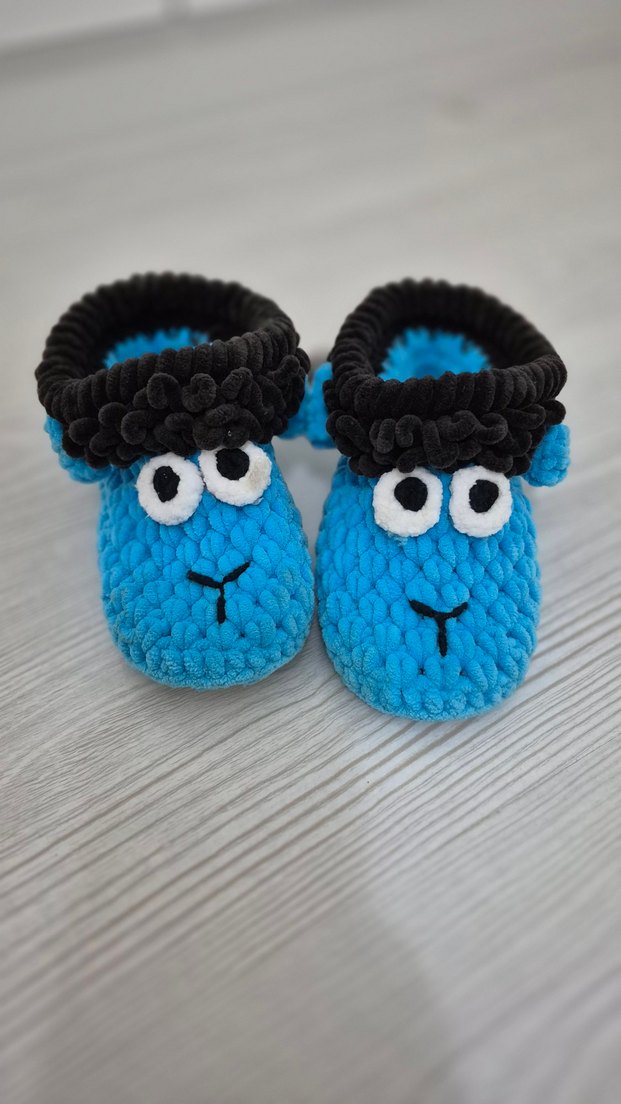 Renkli mavi örgü erkek bebek patikleri, işlenmiş sevimli göz detaylarıyla. Yumuşak ve rahat, küçük ayaklar için uygun.