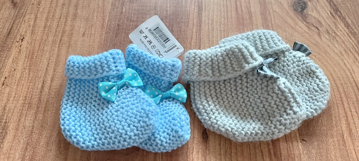 Mavi renkli, nakış detaylı örgü erkek bebek patikleri, yumuşak ve rahat örgü kumaştan üretilmiştir. mavi olan yeni etiketli, gri olan bi kaç kez kullanıldı