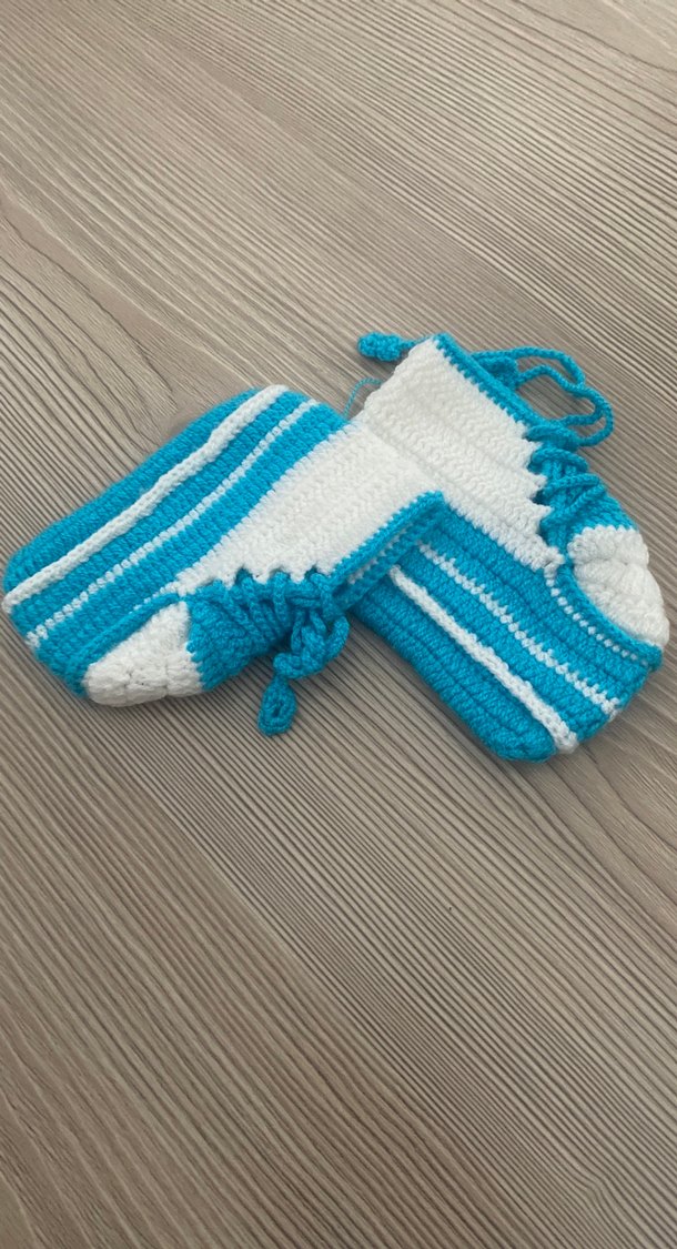 Örgüden yapılmış, mavi ve beyaz renklerde bohem tarzında erkek bebek patikleri, yumuşak ve sıcak tutar.