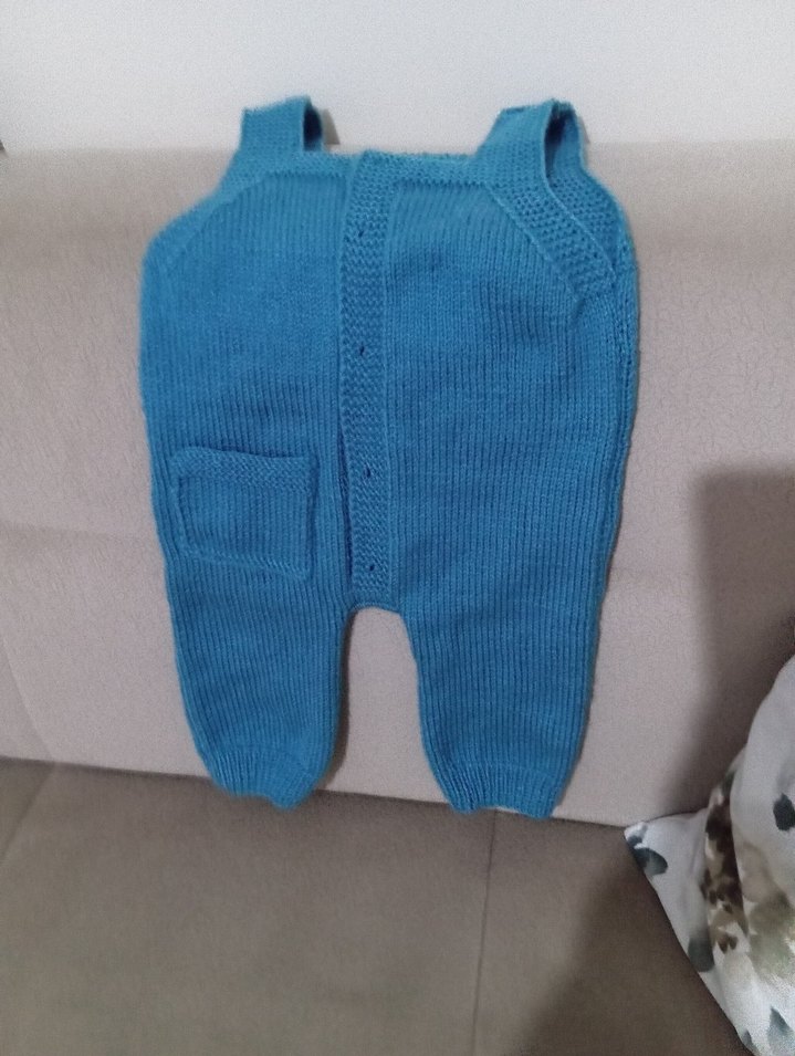 Mavi, örgü kumaştan yapılmış, kolsuz erkek bebek tulumu. Notched lapel yakalı ve önünde küçük cep bulunur.