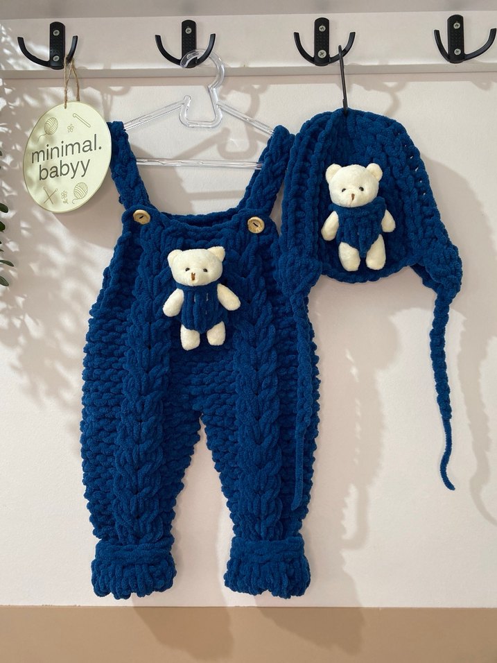 Mavi renkli, örgü kumaştan yapılmış, ayarlanabilir askılı tulum ve şapka seti. Her ikisinde sevimli ayıcık detayları bulunur, normcore tarzda ve sade tasarımlıdır.