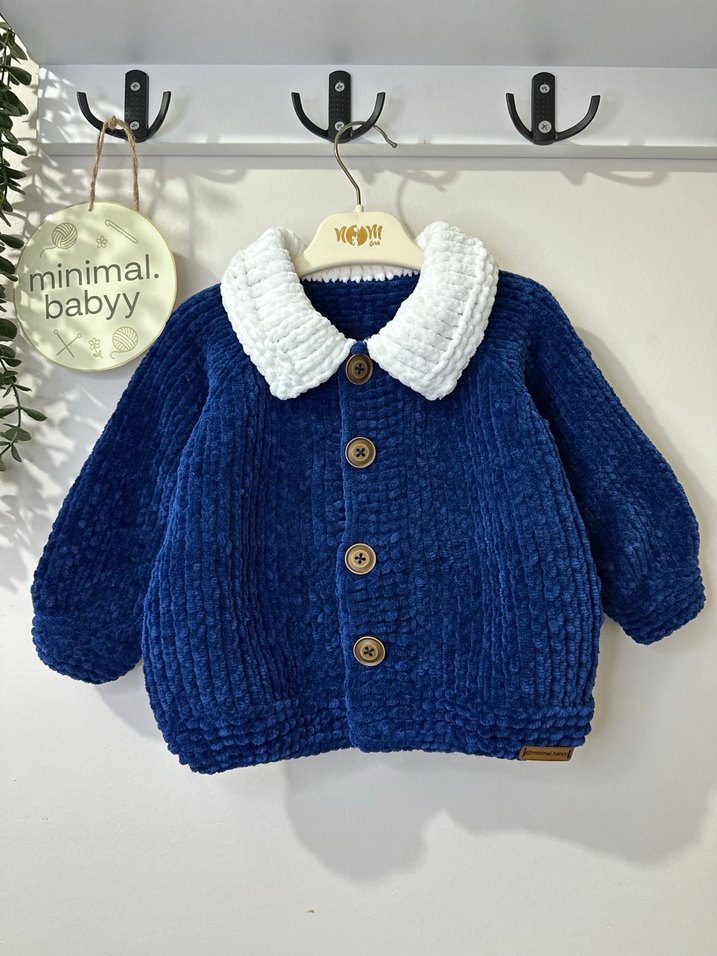 Uzun kollu, beyaz örgü yakalı ve düğmeli mavi renkli erkek çocuk hırkası, rahat kesim ve modern klasik tarzda, yumuşak örgü kumaştan yapılmıştır.