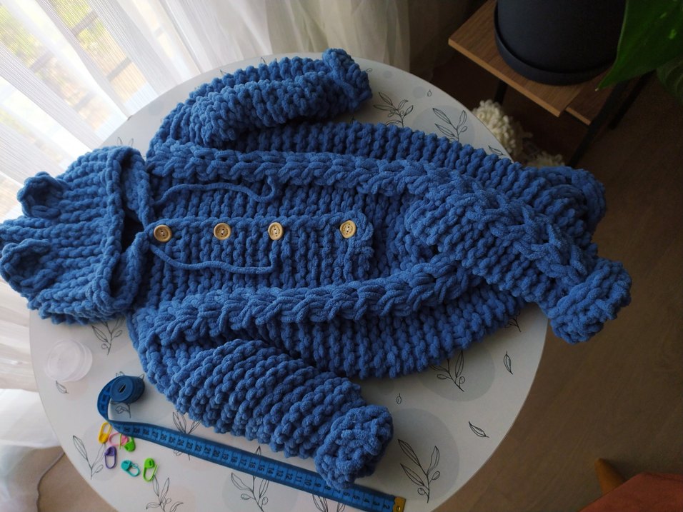 Mavi, uzun kollu, bohem tarzda, düğmeli, örgü erkek çocuk tulumudur. Yumuşak örgü kumaştan üretilmiştir.