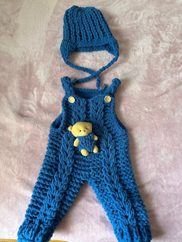Mavi Örgü Erkek Çocuk Tulum ve Şapka Seti