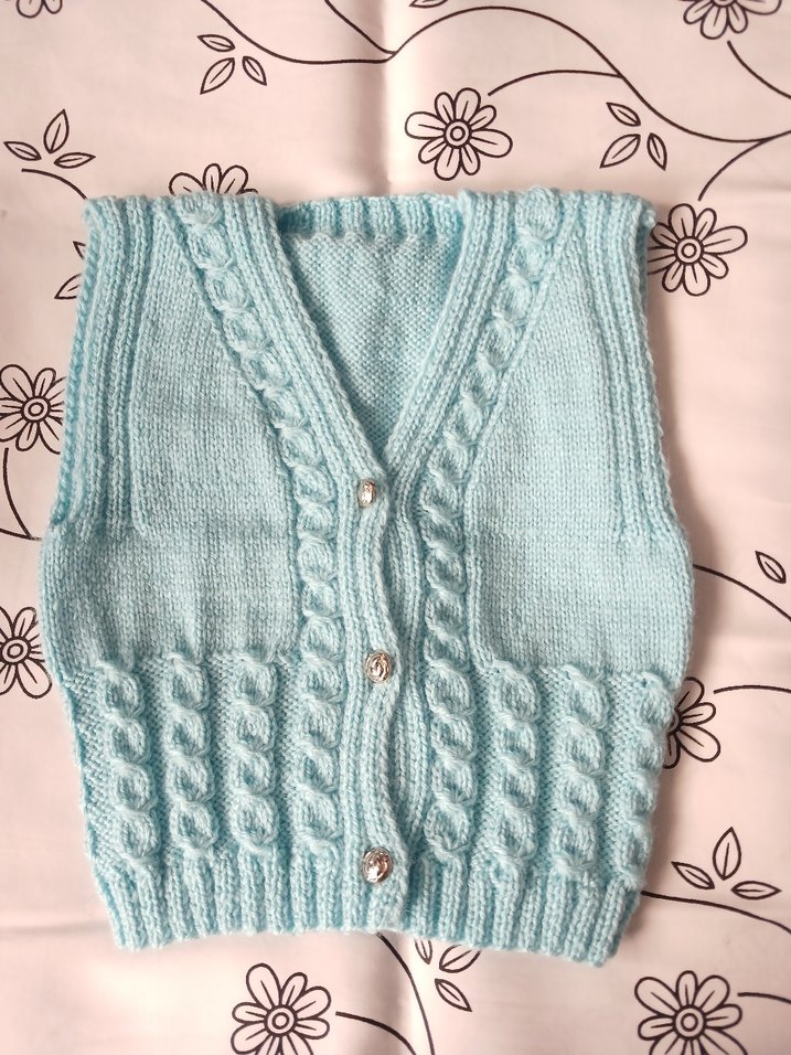 Yeni örüldü taptaze. Mavi pastel renkte, V yaka ve regular fit kesim, yumuşak örgü kumaştan örülmüş erkek çocuk yeleği.