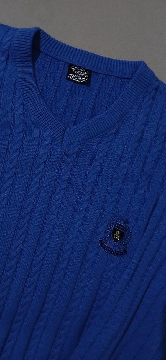Mavi renkli, örgü erkek kazak, bisiklet yaka ve uzun kolludur. Renkli nakış detaylarıyla trend sokak giyimine uygun bir modeldir.
