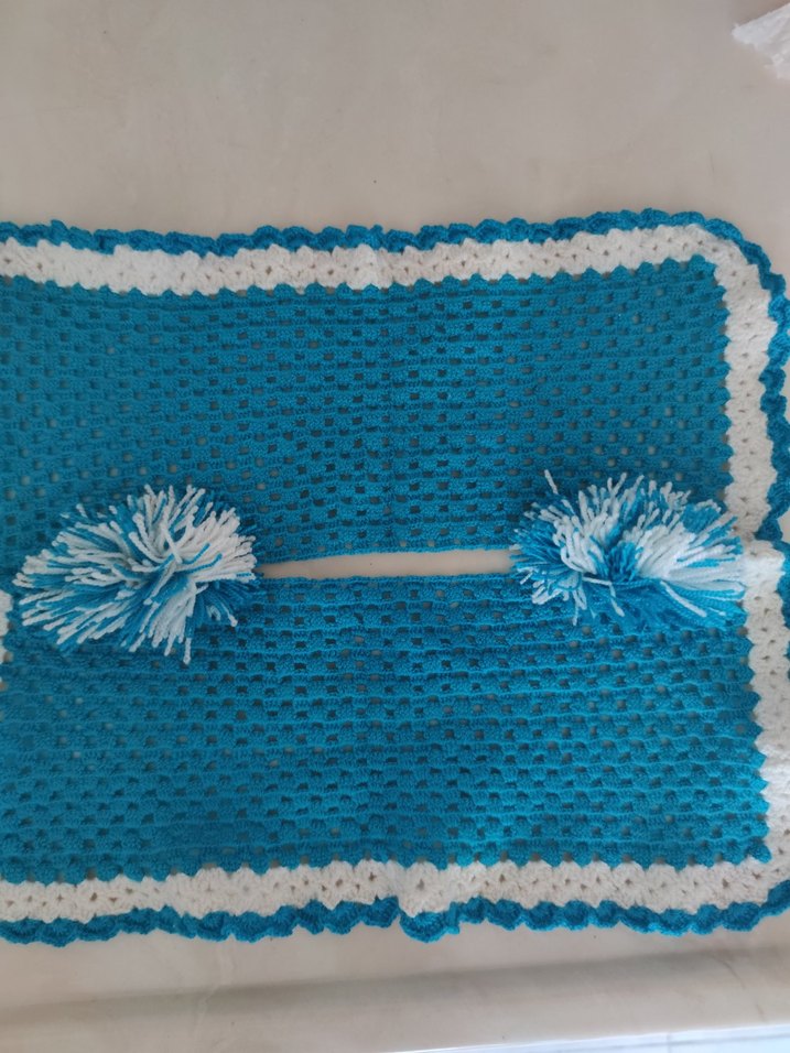 Renkli mavi örgü eskilerden saplı gırgır örtüsüdür değerlendirmeye uygundur Kenarlarında süsleyici ponponlar bulunur.