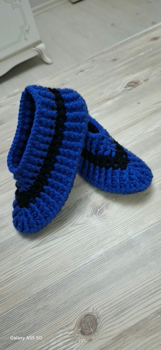 mavi renkli, örgüden yapılmış ev terlikleri. Siyah çizgili sade ve rahat tasarıma sahiptir. ev botu altı keçeli kadife ip