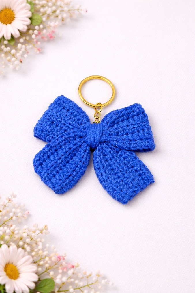 Yumuşak örgü kumaştan yapılmış, altın renkli halka detaylı renkli mavi fiyonk anahtarlık. Rahat ve bohem tarzda bir aksesuar.