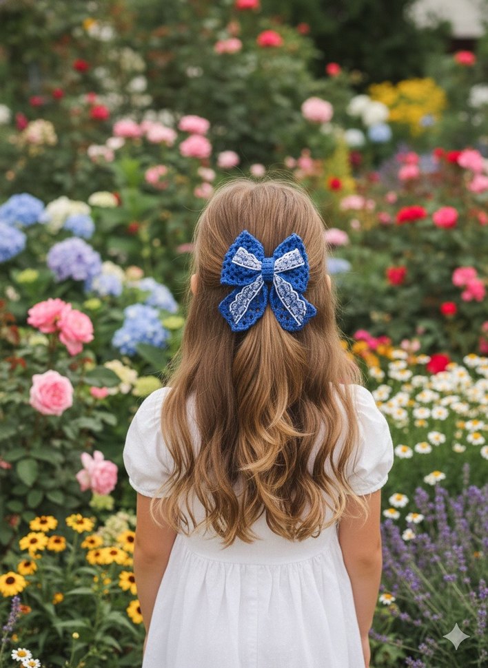 Dantel detaylı mavi örgü fiyonk saç aksesuarı, bohem ve retro tarzlar için renkli bir dokunuş sağlar.