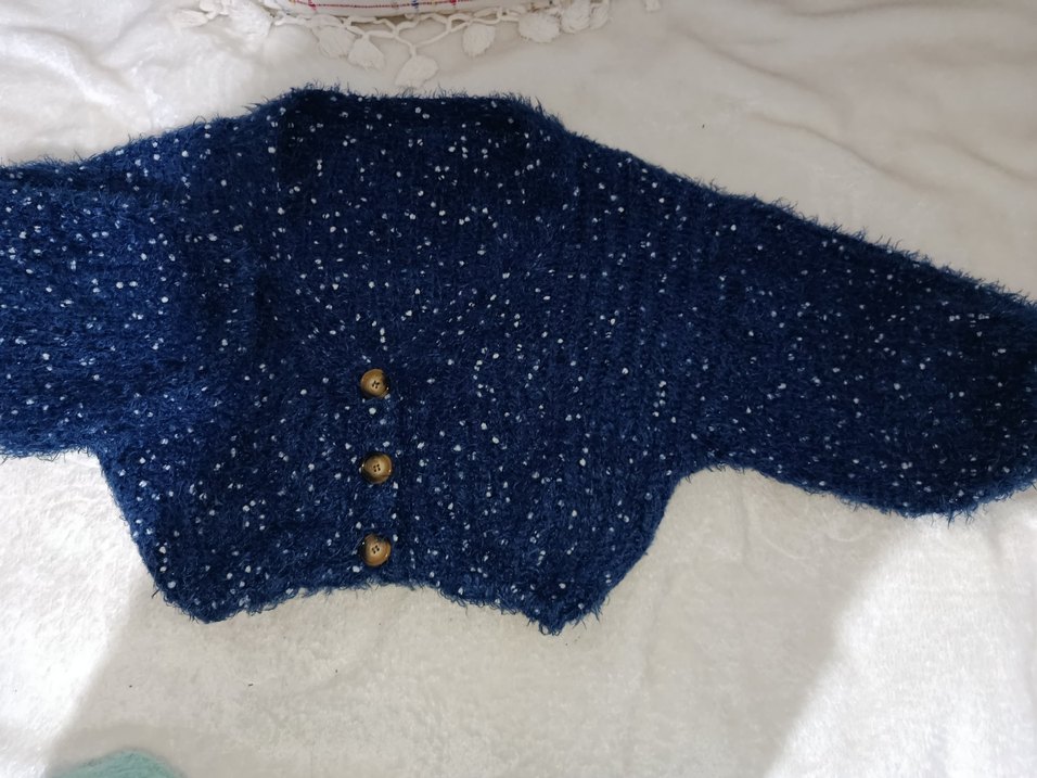 Koyu mavi renkli, örgü hırkası. Notlu yaka ve uzun kollu, bol kesim ve midi boydadır. Üç düğmeli sade ve rahat tasarım zara markası batma olduğu için kesmiştim
