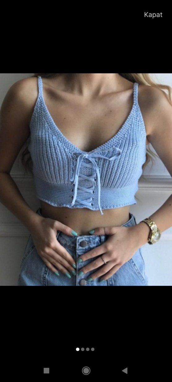 Mavi örgü kısa crop top, V yakalı ve ip askılı, önünde bağcık detayı ile bohem şıklık sunar.